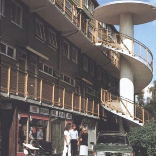 Selvaag bygger Norges første serieproduserte boliger på Bestum i Oslo. Standardisering og seriebygging av boliger er et viktig bidrag til å løse boligmangelen etter krigen. I begynnelsen ville ikke Olav Selvaag bygge blokker. Dette omgikk han smart i den første eiendommen med to spiraltrapper.